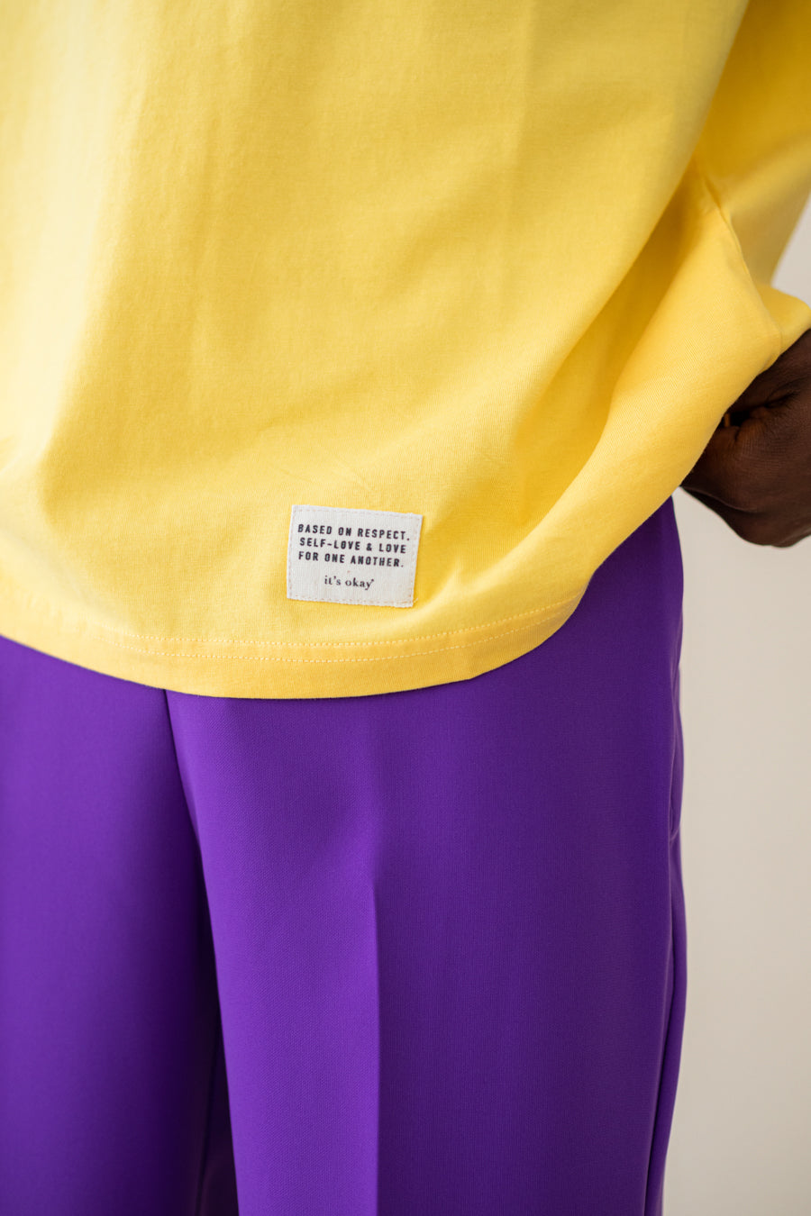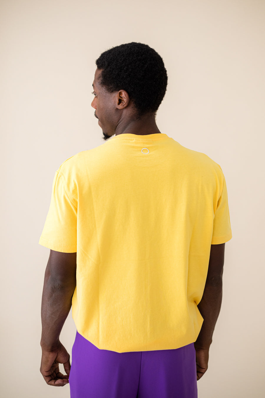Our warm yellow organic t-shirt is one of our best-sellers. This tee is crafted from 100% organic cotton in North Portugal. This 220gsm is adorned with our embroidered brand name on the front and a circle logo on the back. Perfect for your everyday mood, this yellow tee provides a comfortable and relaxed fit for enhanced comfort. Check out the exterior label at the bottom, reflecting our values of respect, self-love and love.